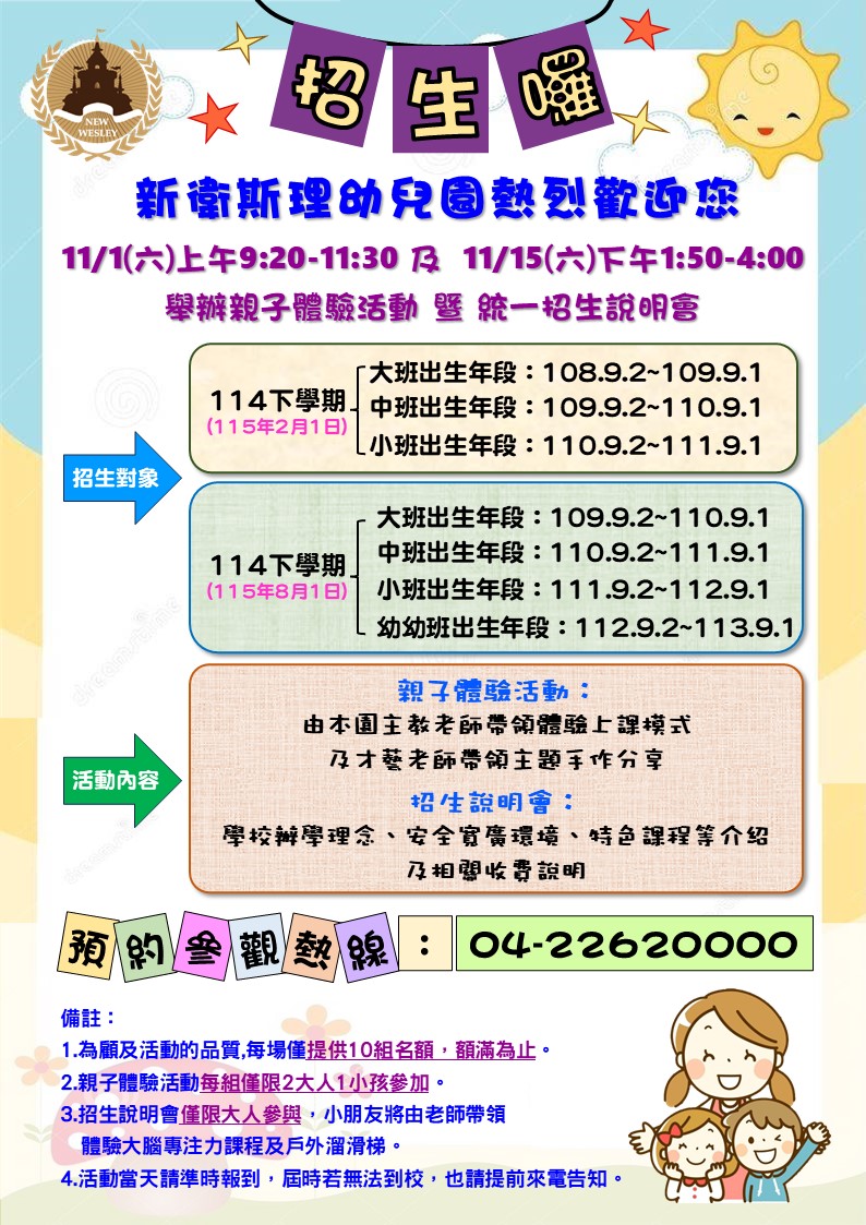 環境特色課程及收費內容,名額有限,歡迎踴躍來電預約報名參觀!☎️來電預約參觀熱線:04-22620000